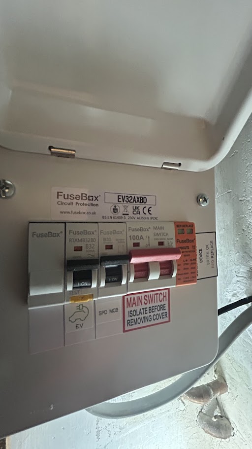 The electricity supply was safely isolated before installing a new metal consumer unit complete with surge protection. A dedicated 40A bi-directional RCBO was installed to supply the EV charger circuit.